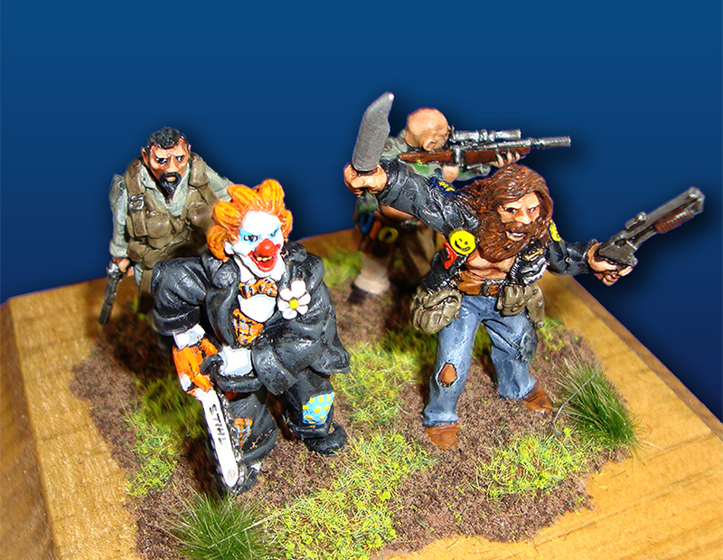 Cluster of four undead Designed by artist Richard Deasey, this collection of zombies designed to support the All Things Zombie game series, is modeled in 28mm (1:56 scale) and is painted by Evil Bob’s Painting Service.