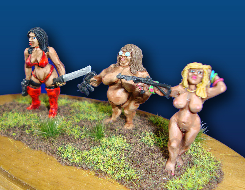 Cluster of four female crazies and cultists. Designed by artist Richard Deasey, this collection of zombies designed to support the All Things Zombie game series, is modeled in 28mm (1:56 scale) and is painted by Evil Bob’s Painting Service.