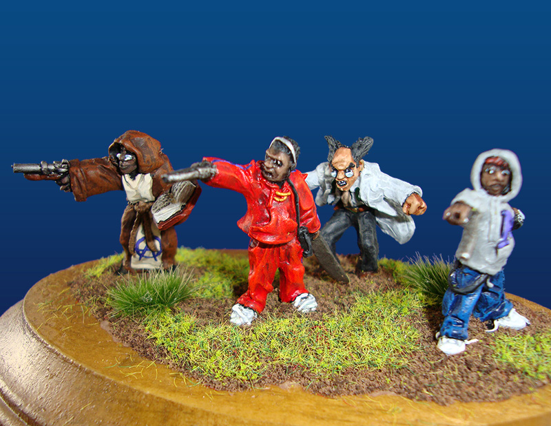 Cluster of Cluster of four Male Crazies and Cultists Designed by artist Richard Deasey, this collection of zombies designed to support the All Things Zombie game series, is modeled in 28mm (1:56 scale) and is painted by Evil Bob’s Painting Service.
