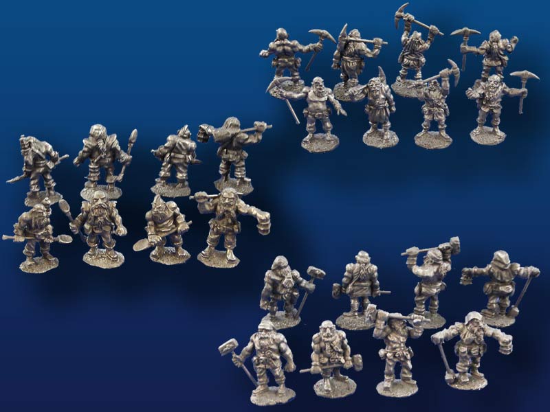 Includes these plus other Dwarven figures - Dwarven Miners w/ Pick Axes (4)Dwarven Miners w/ Shovels & LanternsDwarven Miners w/ Sledge Hammers (4)
