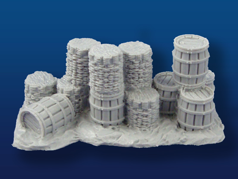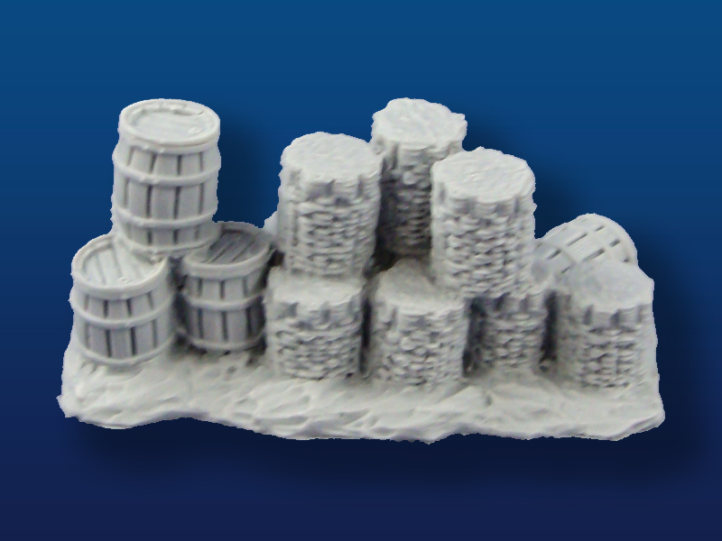 Description: Barrel/Gabion Field Fortification #1 Scale: 28mm Dimensions: 90mm Length 38mm height Material: Urethane Plastic