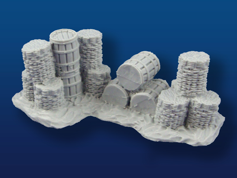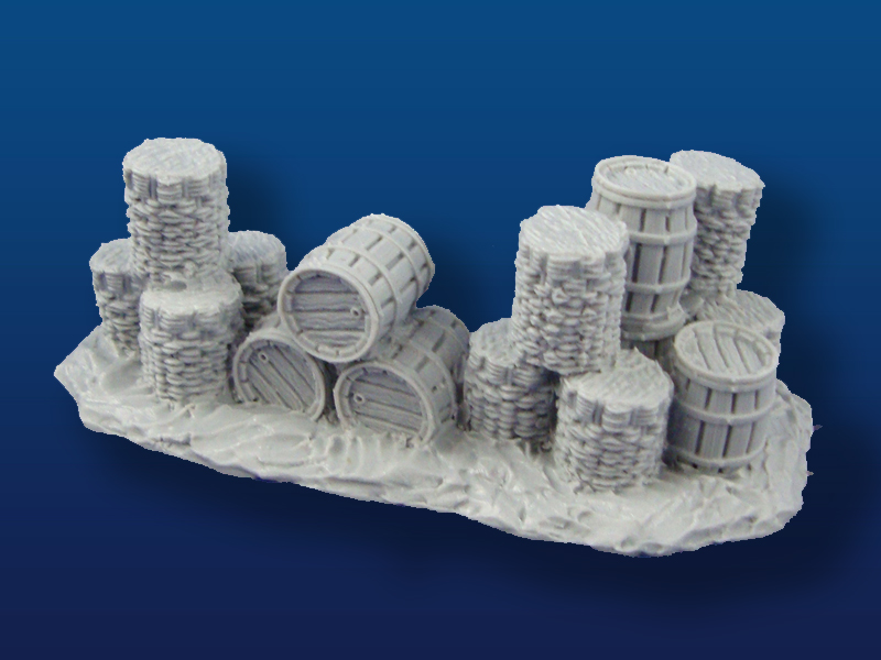 Description: Barrel/Gabion Field Fortification #1 Scale: 28mm Dimensions: 115mm Length 38mm height Material: Urethane Plastic